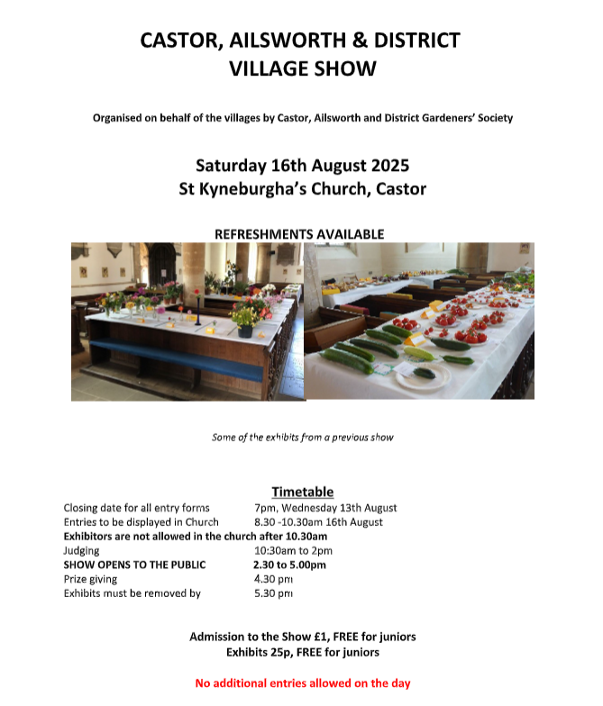 Our Next Event is : Annual Village Show , Saturday 16th August 2025, at St Kyneburgha Church, Castor , 2.30 – 5pm.